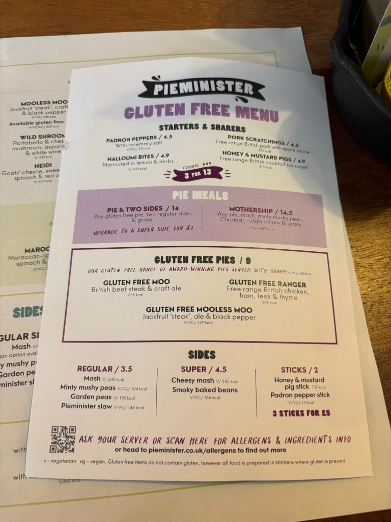 I remember visiting a branch of Pieminister on London’s South Bank years ago—back when I could eat gluten. Eating pie, mash, and gravy from a cardboard carton with a wooden fork had a certain charm, but what I remembered most was how delicious the pies were. Knowing they now had gluten-free options, I was keen to try one at their Manchester branch.
